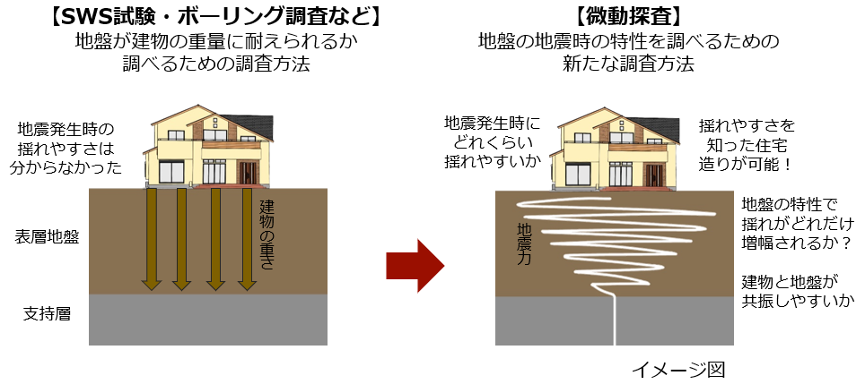 また、SWS試験やボーリング試験に加えて微動探査も行うことによってより地盤の特性がより一層分かります。