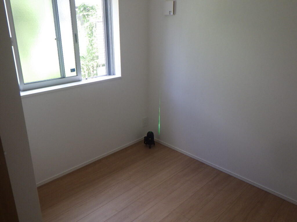 壁を測るものとして、下げ振りという糸にオモリがついたもので測定する方法もありますが、この下げ振りは壁にピンで固定するため壁に穴があくため、仕上げをした場合は不向きです。