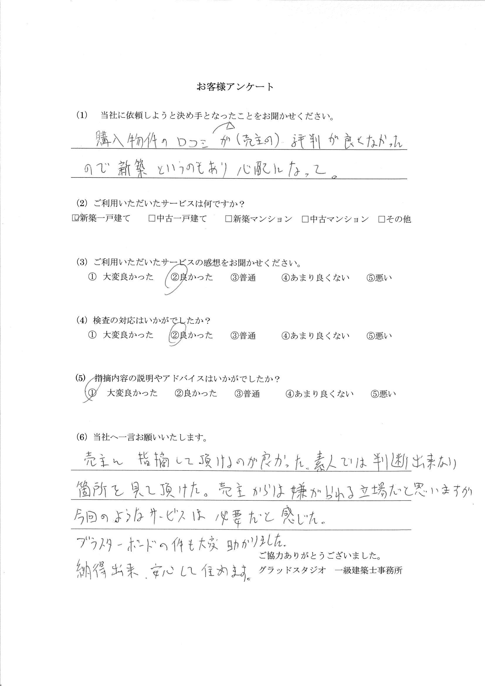ご依頼のきっかけ:購入物件の売主の口コミがよくなかったので、新築というのもあり心配になって。